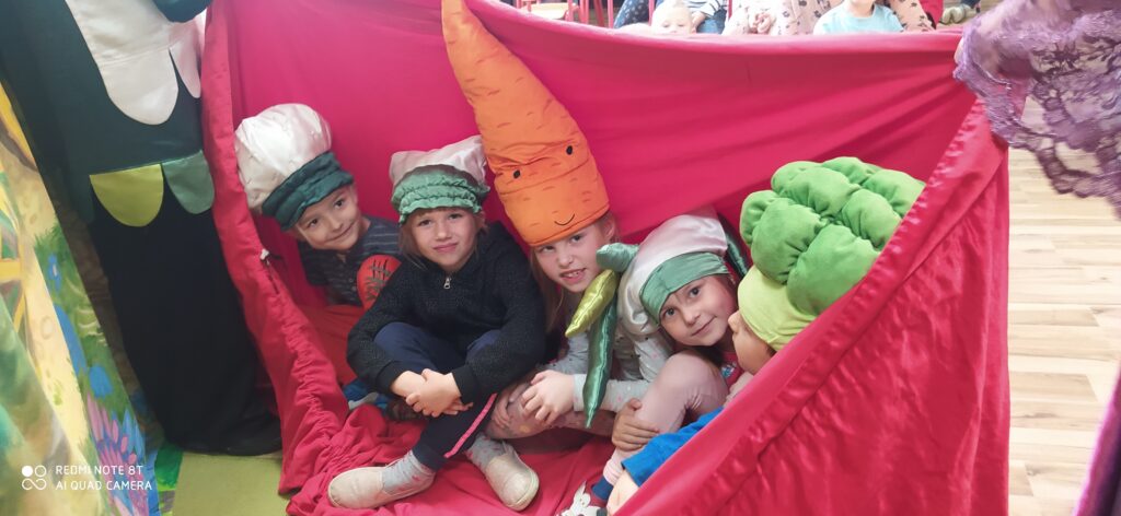 W dniu 27 października nasze przedszkole odwiedzili prawdziwi artyści teatralni. Tym razem aktorzy zaprezentowali naszym przedszkolakom przedstawienie pt. ,,Królowa Jarzynowa”. Dzieci dowiedziały się, dlaczego por, seler, marchewka i pietruszka nazywane są ,,włoszczyzną” oraz dlaczego jedzenie warzyw jest ważne dla naszego zdrowia.,