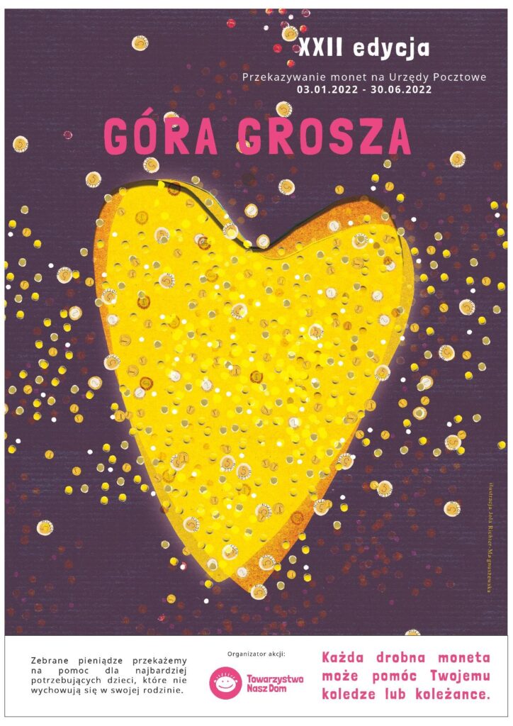 Serdecznie zapraszamy do udziału w akcji ,,Góra Grosza” organizowanej przez Towarzystwo Nasz Dom. Celem akcji jest zebranie funduszy na pomoc dzieciom wychowującym się poza własną rodziną. W ramach akcji przeprowadzona jest zbiórka monet o nominałach od 1 grosza do 5 złotych. Akcja Góra Grosza organizowana jest w naszym przedszkolu od 04.11.2021r. do 31.12.2021r.