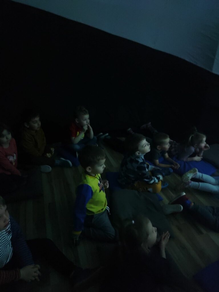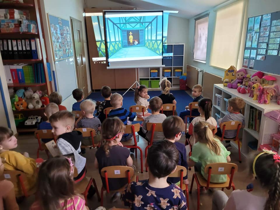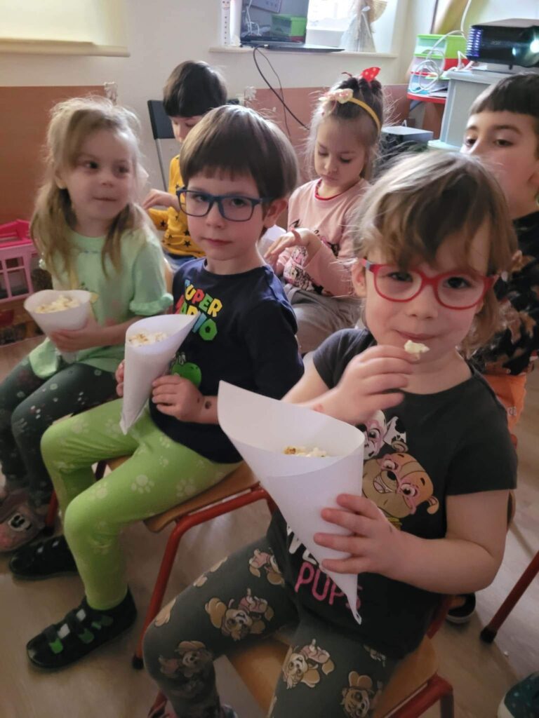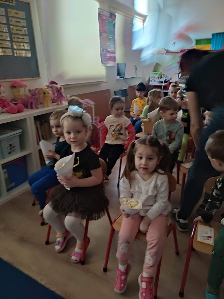 W naszym przedszkolu zorganizowaliśmy mini kino. Przed projekcją bajki dzieci poznały zasady poprawnego zachowania w czasie seansu. Każde dziecko ,,zakupiło,, bilet do kina, po czym wszyscy udali się do sali kinowej. Oczywiście nie obyło się bez popcornu przygotowanego dla każdego przedszkolaka. Dzieci poczuły się jak w prawdziwym kinie. Wszyscy byli bardzo zachwyceni przygotowaną niespodzianką.
