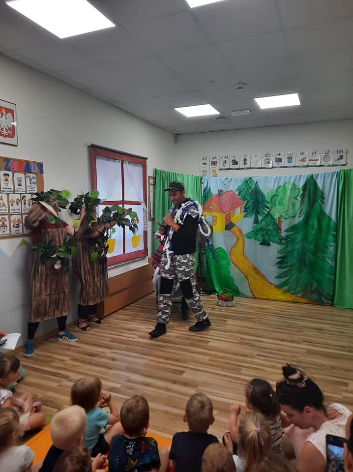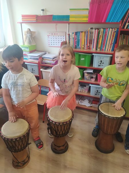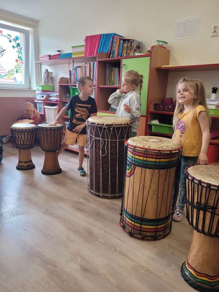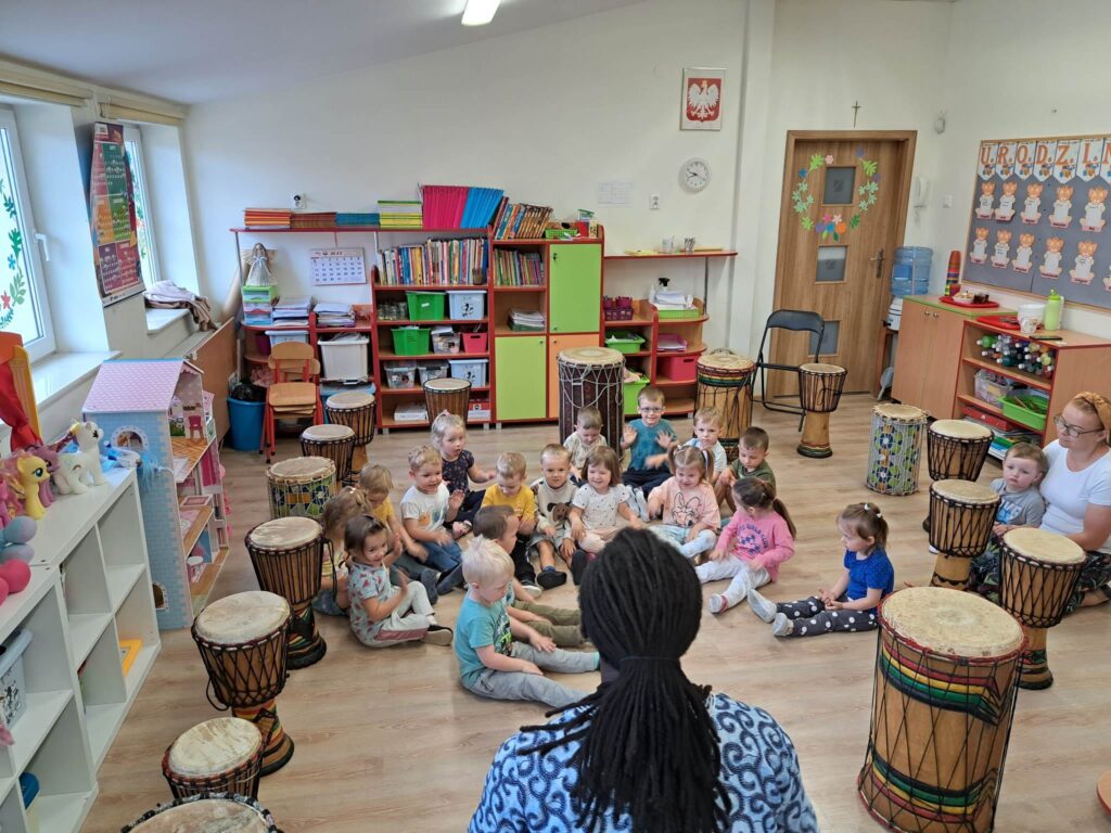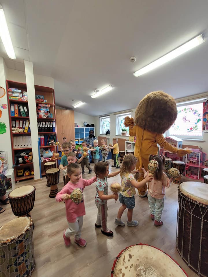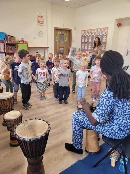 Warsztaty bębniarskie AfroRytmika- muzyczna podróż do Afryki. Poprowadził je Gaspard Conde gwinejski muzyk , mistrz gry na bębnach afrykańskich. Artysta uczył dzieci podstawowych technik wydobywania dźwięków wykorzystując w tym celu różnego rodzaju instrumenty etniczne takie jak: dun dun, djembe, afrykańskie grzechotki stykfy. Podczas zajęć każde dziecko mogło być muzykiem, dyrygentem, a także poprzez improwizację mogło stworzyć własny rytm. Podczas gry na różnorodnych instrumentach etnicznych przedszkolaki doznały wiele radości i satysfakcji z możliwości tworzenia własnych rytmów, przeżyły niezwykłą zabawę. Towarzyszył nam również Lew Bartek, który przybył do nas z samego serca Afryki, po tym jak usłyszał gorące rytmy.