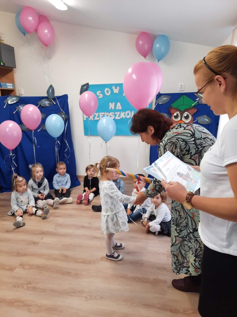 Dzień 26 października pozostanie na długo w pamięci dzieci z grupy Sówek.Tego właśnie dnia odbyła się ich pierwsza ważna przedszkolna uroczystość-pasowanie na przedszkolaka. Uroczystość rozpoczęła się od powitania gości i przedstawienia krótkiej części artystycznej, w której maluszki zaprezentowały swoje umiejętności- dając tym samym dowód, jak dużo już potrafią. Były więc piosenki, wierszyki i taniec. Po części artystycznej dzieci obiecały: zgodnie bawić się w przedszkolu, przychodzić każdego dnia z uśmiechem, słuchać pani i pomagać kolegom , być dzielnym przedszkolakiem. Następnie Pani dyrektor – Grażyna Kaliszewska dokonała uroczystego pasowania każdego dziecka na przedszkolaka. Na pamiątkę tego ważnego wydarzenia, każdy przedszkolak otrzymał dyplom pasowania.
