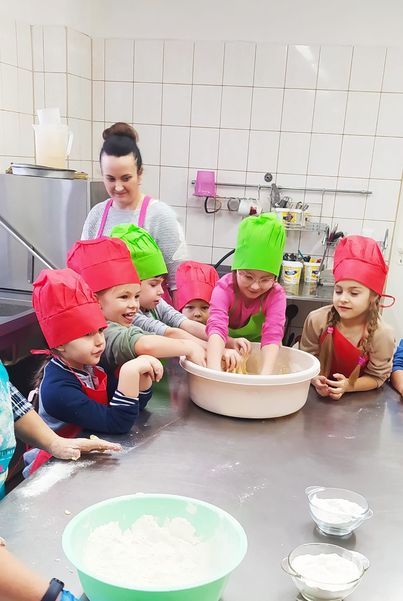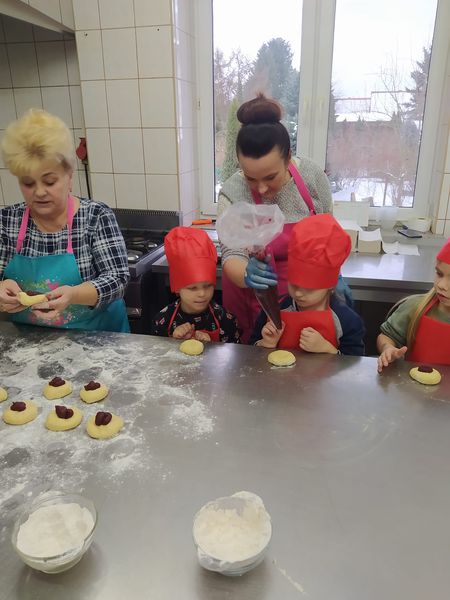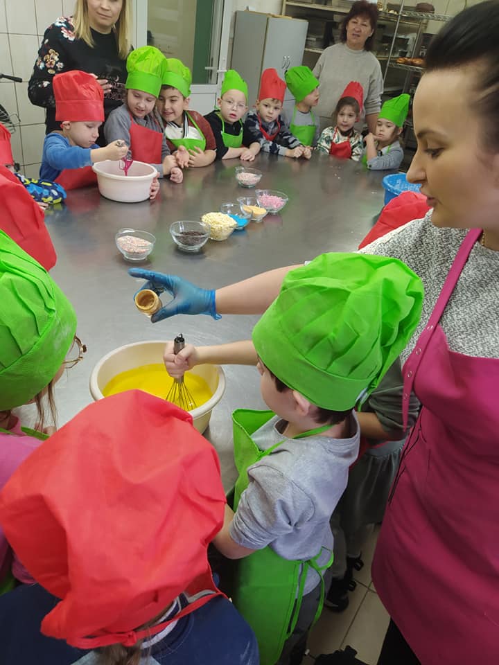 Przed nami tłusty czwartek, a dzieci z naszego przedszkola już 7 lutego pod czujnym okiem Pani Basi i Pani Karoliny własnoręcznie wyrabiały ciasto na pączki, przygotowywały lukier, wybierały nadzienie no i oczywiście ozdabiały. Obserwowały też proces smażenia pączków. Z ogromnym zainteresowaniem przysłuchiwały się cennym informacjom na temat pracy cukiernika. Na koniec otrzymały dyplom młodszego czeladnika oraz medale. Oczywiście wszyscy zasiedliśmy też do stołu skosztować naszych pączków, były wyśmienite. Serdecznie dziękujemy właścicielom cukierni ,,U Basi”- mamie i babci Eryka za tak perfekcyjnie przeprowadzone warsztaty.